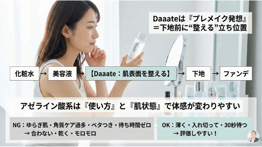 👉 「プレメイクスムースローション【Daaate】の特徴・使い方・向く人をまとめて見る」