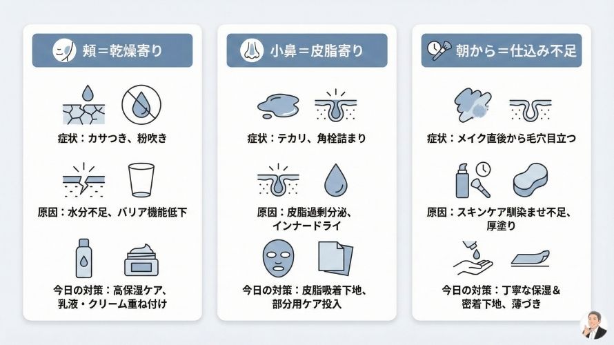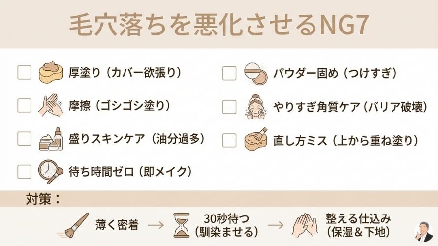• 毛穴落ちは「ざらつき・乾燥・皮脂・厚塗り」の合わせ技