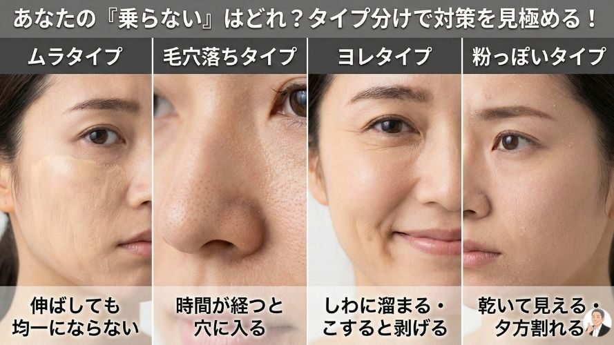 原因候補: 朝の落としすぎ/保湿不足/パウダー固めすぎ