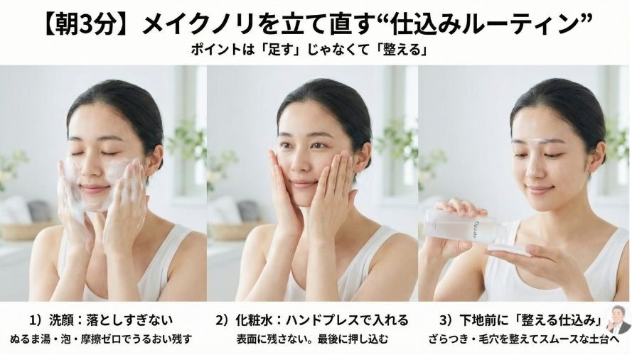 【朝3分】メイクノリを立て直す“仕込みルーティン”(これだけやればOK)